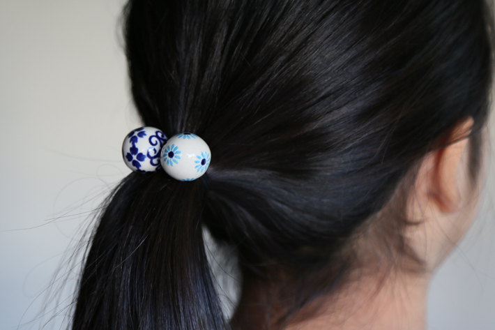 このようにビーズ2個に紐ゴムを通すと、ヘアゴムのできあがり。選ぶ柄によって雰囲気も変わります。