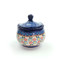 蓋の持ち手部分は蔓のようなデザインで、滑りにくく持ちやすい機能美を併せ持っています。ボディ部分のリムはよく見ると花びらのように縁どられ、とても愛らしいシェイプです。蓋に溝が無いタイプなので、シュガーポット以外の用途でも幅広く使えます。