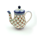 少し錆色が混じったような濃く深い赤色が主役になったパターンデザインは、ポーランド食器に使われる色使いとしては実は珍しい部類です。この赤い花と深緑の小さな葉が格子状に組み合わさってリズミカルで愛らしい雰囲気が生まれました。