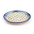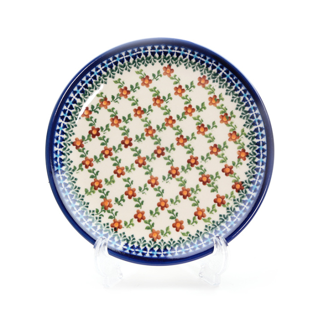 少し錆色が混じったような濃く深い赤色が主役になったパターンデザインは、ポーランド食器に使われる色使いとしては実は珍しい部類です。この赤い花と深緑の小さな葉が格子状に組み合わさってリズミカルで愛らしい雰囲気が生まれました。