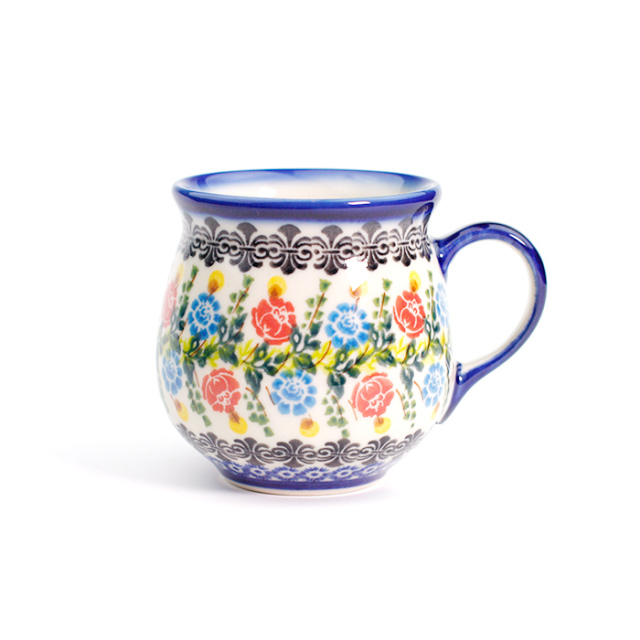 飲み口の下の部分がくびれて、膨らんだボディ。ポーランド食器の特徴的な形状で、最も人気のある形のマグカップです。ポーリッシュマグも製造元によって少しずつ形が違っていて、カリヒ社のマグはなだらかなティアドロップ状のカーブが印象的です。