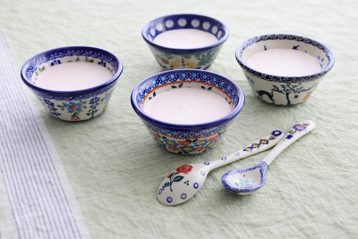 直線的なラインが特徴のミニボウルで、スタッキング性も優れています。アイスクリームならシングル、カップケーキが1個納まる位のサイズ感です。オーブンにも入れられるのでプリンも作れます。ムースや杏仁豆腐などを1人分冷やし固める型にもぴったり。北欧食器を思わせるすっきりしたフォルムですが、外側にも内側にも絵付けされている手の込んだところがポーリッシュポタリーらしさです。