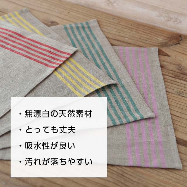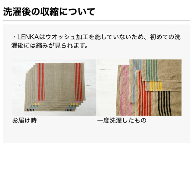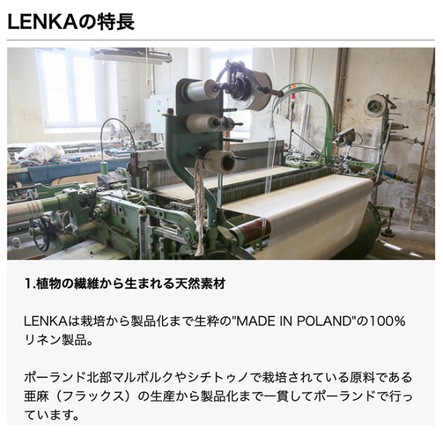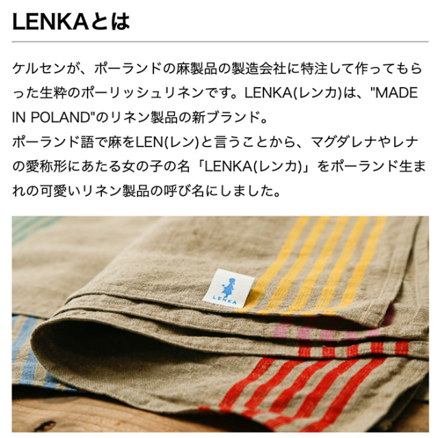 LENKA(レンカ)は、"MADE IN POLAND"のリネン製品ブランド。ケルセンが、ポーランドの麻製品の製造会社に特注して作ってもらった生粋のポーリッシュリネンです。 両端に5本のストライプが入ったデザイン。 天然素材である麻100%の気取らないざっくりした風合いは、ポーリッシュポタリーとの相性も抜群!毎日のテーブルで気軽に使って楽しんでいただけます。 BLACK(黒) シックなイメージの黒。無彩色がカラフルな食器や食材を引き立てます。 ![]() ![]() ![]() ![]() BLUE(青) 爽やかな青。青い食器とよく馴染みますよ! ![]() ![]() GREEN(緑) 落ち着いたやさしい緑色。一番人気です。 ![]() ![]() ![]() ![]() ![]() YELLOW(黄色) ポーリッシュポタリーとの相性が抜群です。 ![]() ![]() ![]() PINK(ピンク) ニュアンスカラーが味わい深いピンク色。 ![]() ![]() ![]() RED(赤) ナチュラルリネンに赤色がとっても映えます。 ![]() ![]() ![]() LENKAとは ケルセンが、ポーランドの麻製品の製造会社に特注して作ってもらった生粋のポーリッシュリネンです。LENKA(レンカ)は、"MADE IN POLAND"のリネン製品の新ブランド。