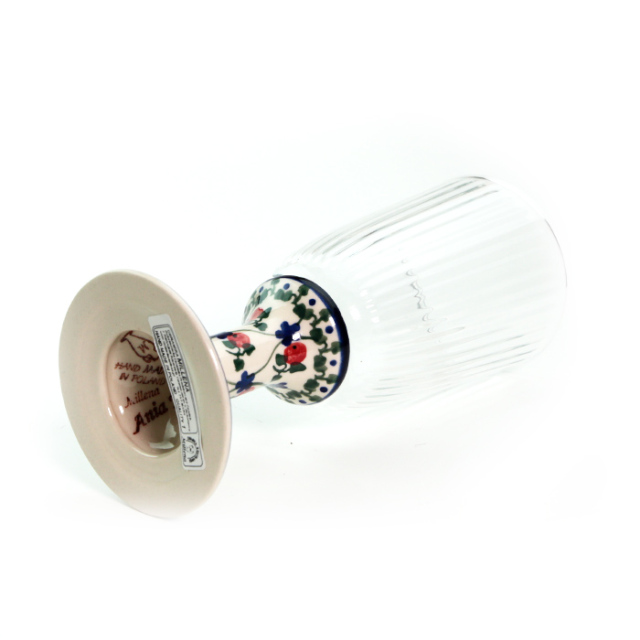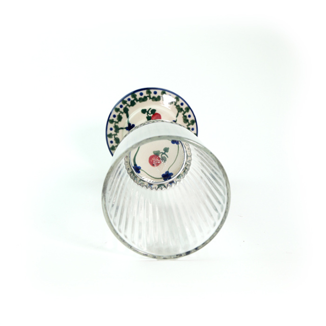 内側に縦筋の入った厚みのあるグラスと、ミレナ社製の陶器のステムとプレートが組み合わさっています。グラスの中を覗き込むと、絵柄のモティーフが見える仕組みです。どっしりとした作りのグラスは、ストローで飲むカフェメニューにあるドリンク類にもぴったりです。