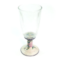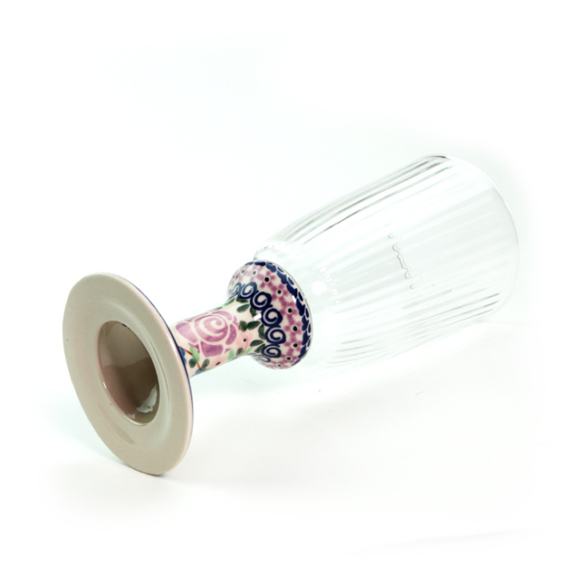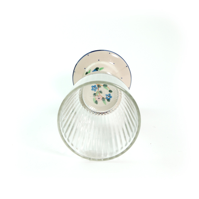 内側に縦筋の入った厚みのあるグラスと、ミレナ社製の陶器のステムとプレートが組み合わさっています。グラスの中を覗き込むと、絵柄のモティーフが見える仕組みです。どっしりとした作りのグラスは、ストローで飲むカフェメニューにあるドリンク類にもぴったりです。
