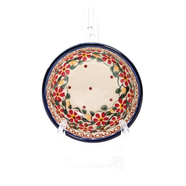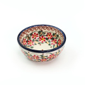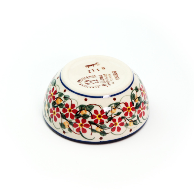 底の部分が直径6cm程度フラットになっています。3口分程度の副菜や1人分のお漬物を装うのにぴったりで小鉢のように使うことができます。ポーリッシュポタリーらしく、側面にも内側にも手作業による絵付けが施されていて、小さなボウルといえども日々使う中で愛着が湧いてくる魅力的な器です。