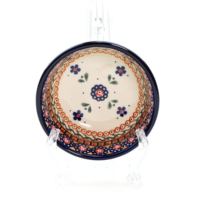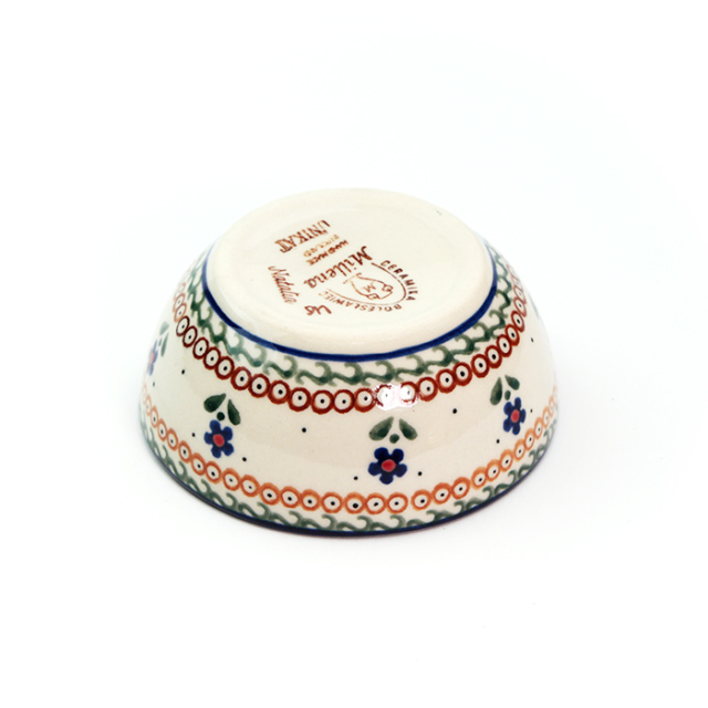 底の部分が直径6cm程度フラットになっています。3口分程度の副菜や1人分のお漬物を装うのにぴったりで小鉢のように使うことができます。ポーリッシュポタリーらしく、側面にも内側にも手作業による絵付けが施されていて、小さなボウルといえども日々使う中で愛着が湧いてくる魅力的な器です。