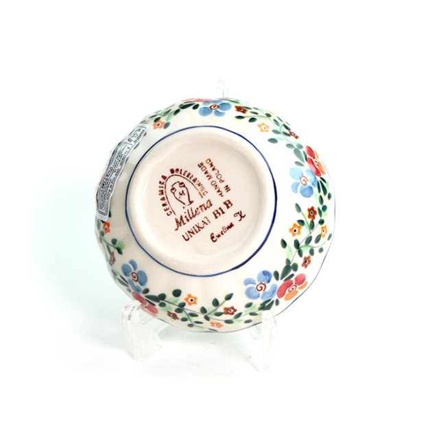 縁取りに使われているフリーハンドでのスケッチのような花柄のスタンプと、花々をつなぐ茎の曲線がとてもミレナらしい雰囲気を出しています。ブルーの小さな花を中心に5色の花々が散りばめられた愛らしいパターンデザインは、柔らかく優しい印象を与えてくれます。