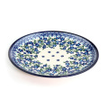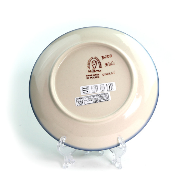 紺色と深緑色、そして水色による、細かなスタンプで構成されています。リズミカルなスタンプワークの中に、枝が細筆で手描きされているところにミレナらしい特徴が現れています。寒色系のシンプルな色使いの器には、トマトやリンゴなどの暖色系の食材との相性もぴったりです。