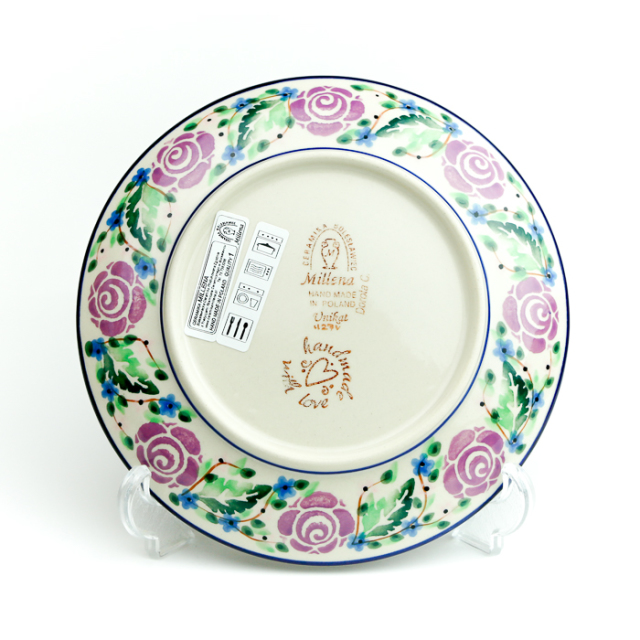 ミレナ社のユニーク柄の平皿には、裏側のリムの部分にも絵付けされているところも大きな魅力となっています。他社には見られない特に手の込んだ仕様で、ハンドメイドならではの華やぎが感じられます。
