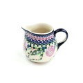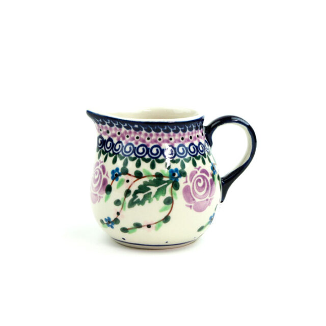 ポーリッシュポタリーではあまり見かけない紫色がこのパターンデザインの特徴です。ばらの花のモティーフは非常にポピュラーですが、手描きのアート柄によくみられる黒い縁取りが無く、ばらの花弁の意匠化が素晴らしいところがチャームポイント。全体として紺色、紫色、余白がバランスの良い仕上がりに結びついていることも、この絵柄が支持されている理由となっています。