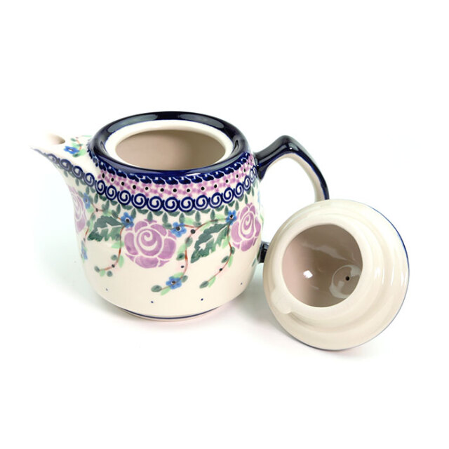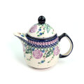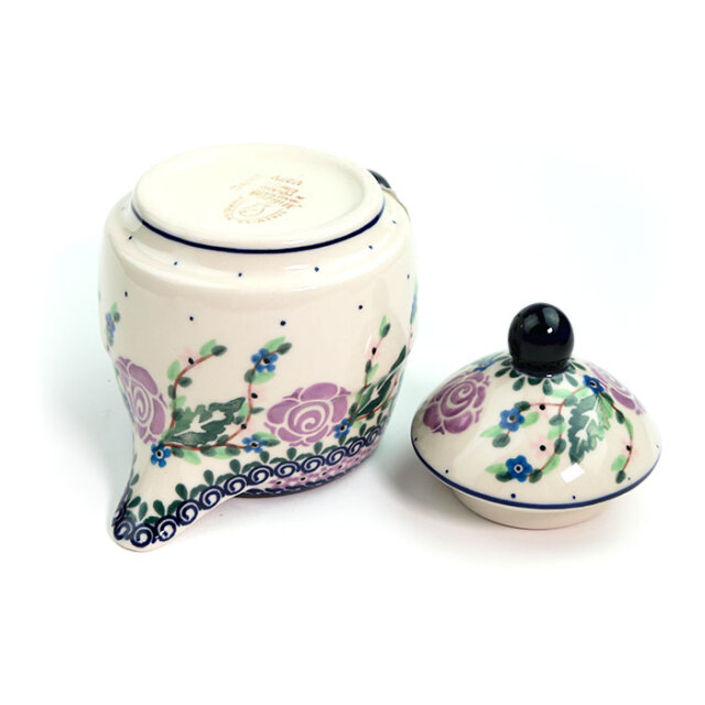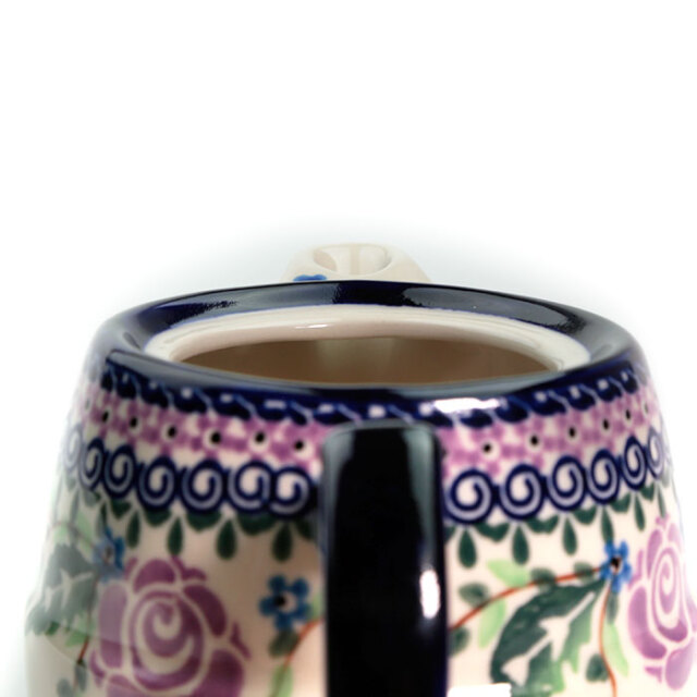 ポーリッシュポタリーではあまり見かけない紫色がこのパターンデザインの特徴です。ばらの花のモティーフは非常にポピュラーですが、手描きのアート柄によくみられる黒い縁取りが無く、ばらの花弁の意匠化が素晴らしいところがチャームポイント。全体として紺色、紫色、余白がバランスの良い仕上がりに結びついていることも、この絵柄が支持されている理由となっています。