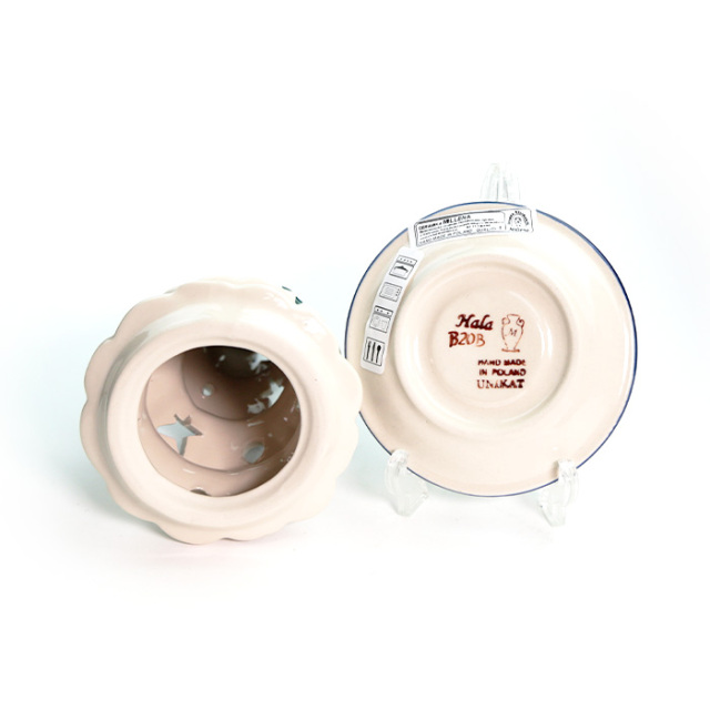 紺色と深緑色、そして水色による、細かなスタンプで構成されています。リズミカルなスタンプワークの中に、枝が細筆で手描きされているところにミレナらしい特徴が現れています。寒色系のシンプルな色使いの器には、トマトやリンゴなどの暖色系の食材との相性もぴったりです。