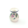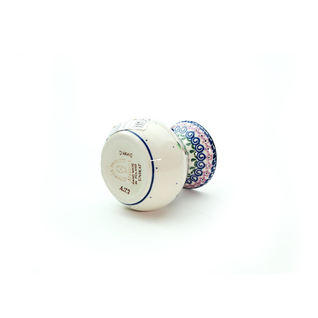 ポーリッシュポタリーではあまり見かけない紫色がこのパターンデザインの特徴です。ばらの花のモティーフは非常にポピュラーですが、手描きのアート柄によくみられる黒い縁取りが無く、ばらの花弁の意匠化が素晴らしいところがチャームポイント。全体として紺色、紫色、余白がバランスの良い仕上がりに結びついていることも、この絵柄が支持されている理由となっています。
