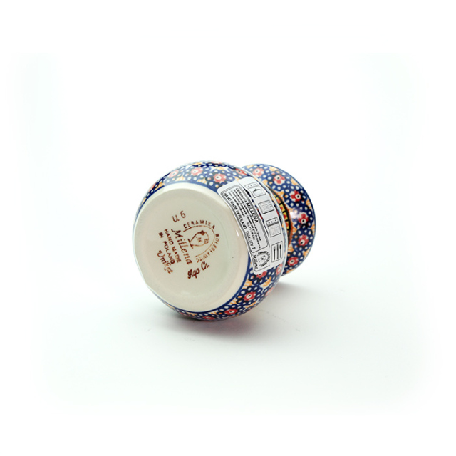 茶と赤と紺の色の組み合わせが独特の雰囲気を醸し出しているミレナ社の人気のパターンデザイン。小さなスタンプが何度も重ねて押される細かなスタンプワークが、この緻密な柄を印象付けています。さらに余白部分に花のスタンプを置くことで適度な空間が生まれ、くど過ぎないバランスが取れている優れた意匠です。
