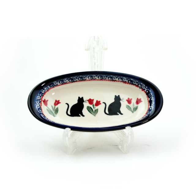 座った猫のシルエットとチューリップがモティーフの愛らしく微笑ましいパターンデザインです。猫のひげはよく見るとひとつひとつが異なっており、手描きされていることが窺えます。ポーランド生まれの猫たちの表情を想像すると、日々使う楽しみも膨らみますね。