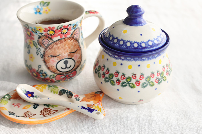 ぷっくりしたフォルムがとっても可愛いシュガーポット。ふたにスプーンを入れる溝の無いタイプなので、お砂糖入れとしてだけではなく、幅広くご利用いただけます。ジャム、梅干し、佃煮、漬物などを入れて意表を突いた楽しみ方もおすすめです。ふたを開けると中底にも小さなモティーフが描かれていて、可愛らしさも満点です。