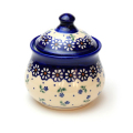 縁取りに使われている8つの花弁の花柄スタンプは、ポーリッシュポタリーのスタンプの中でも最もポピュラーなもののひとつ。クリーム色の余白の部分には、青い小花とドットがあしらわれています。比較的シンプルな構成ながら、バランスの取れたデザインであり、清楚な愛らしい雰囲気に包まれています。