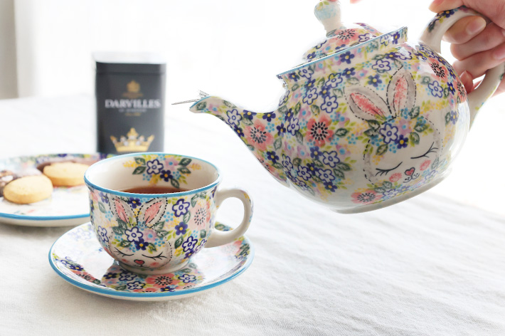 愛くるしいうさぎとフローラルな背景が醸し出すふんわりとした雰囲気のパターンデザインです。お花に埋もれてお昼寝をしているような表情も、ひとつひとつが筆描きされています。紺の縁取りが多いポーリッシュポタリーでは珍しい、水色の縁取りも特徴的です。