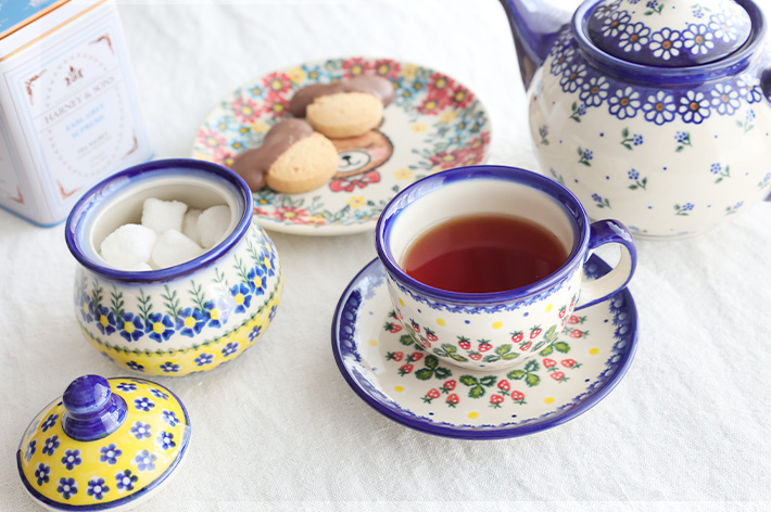 丸みを帯びたシェイプと飲み口に向かった美しい曲線は、優雅さと可愛らしさを併せ持ち、大切なお客様にも楽しんでいただける素敵な時間を演出します。ポーリッシュポタリーらしく柄を違えて揃えるのもおすすめ。様々なパターンデザインを鑑賞しながらの会話も弾みます。忙しい朝や一人で過ごす午後の時間も気分を上げてくれるカップ&ソーサーで、毎日を美しく過ごしたいですよね!