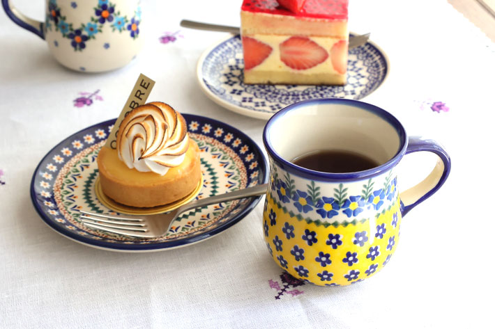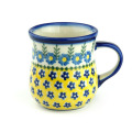 黄色の配色による元気で楽しいイメージの絵柄です。遠目から見ても目立つ印象的なスタンプワークがこの柄の魅力。黄色の中にあるポーリッシュポタリーらしい紺色の小さな花柄のスタンプは、どこかあどけない雰囲気で、可愛らしさの源になっています。