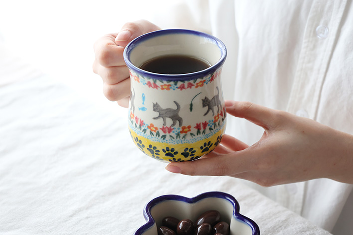 カップの胴部分のカーブが特徴的な大きめのマグカップ。たっぷり飲みたいカフェオレやミルクティにおすすめです。忙しい朝には、カップの上にドリッパーを置いて、コーヒーを直接落としても良いですね。仕事時のデスクにも似合っています。