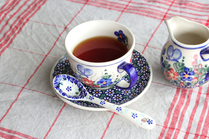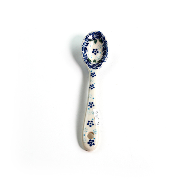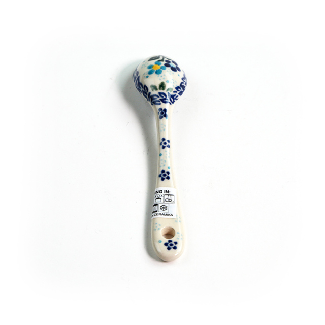 手仕事の粋を感じるポーリッシュポタリーのスプーンです。表と裏のどちらにも細かな絵付けが施され、プリントされたものと比べるまでもなく高級感を味わっていただけます。プリンやゼリーなどのデザートに添えたり、ジャムをすくったり、大きなマグにスープを注いでこのスプーンを添えても絵になる愛らしさです。