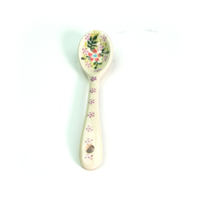 手仕事の粋を感じるポーリッシュポタリーのスプーンです。表と裏のどちらにも細かな絵付けが施され、プリントされたものと比べるまでもなく高級感を味わっていただけます。プリンやゼリーなどのデザートに添えたり、ジャムをすくったり、大きなマグにスープを注いでこのスプーンを添えても絵になる愛らしさです。