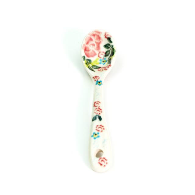 手仕事の粋を感じるポーリッシュポタリーのスプーンです。表と裏のどちらにも細かな絵付けが施され、プリントされたものと比べるまでもなく高級感を味わっていただけます。プリンやゼリーなどのデザートに添えたり、ジャムをすくったり、大きなマグにスープを注いでこのスプーンを添えても絵になる愛らしさです。