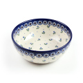 縁取りに使われている8つの花弁の花柄スタンプは、ポーリッシュポタリーのスタンプの中でも最もポピュラーなもののひとつ。クリーム色の余白の部分には、青い小花とドットがあしらわれています。比較的シンプルな構成ながら、バランスの取れたデザインであり、清楚な愛らしい雰囲気に包まれています。