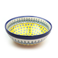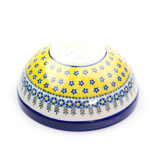 黄色の配色による元気で楽しいイメージの絵柄です。遠目から見ても目立つ印象的なスタンプワークがこの柄の魅力。黄色の中にあるポーリッシュポタリーらしい紺色の小さな花柄のスタンプは、どこかあどけない雰囲気で、可愛らしさの源になっています。