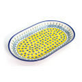 黄色の配色による元気で楽しいイメージの絵柄です。遠目から見ても目立つ印象的なスタンプワークがこの柄の魅力。黄色の中にあるポーリッシュポタリーらしい紺色の小さな花柄のスタンプは、どこかあどけない雰囲気で、可愛らしさの源になっています。