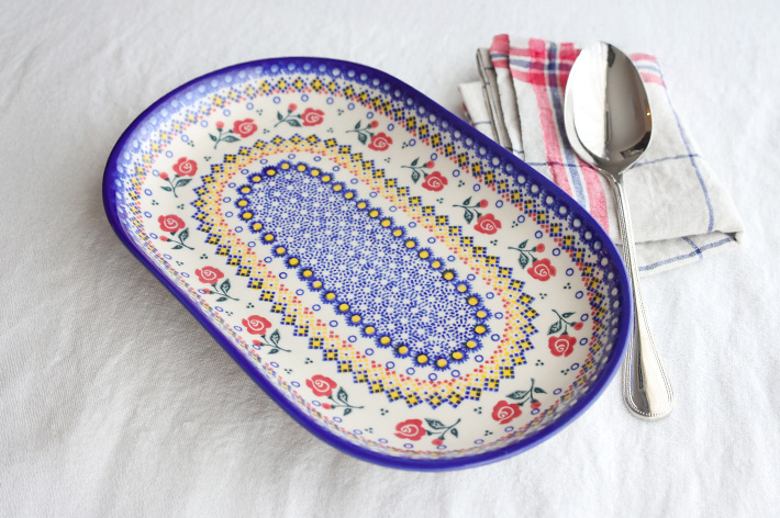 オードブルを盛り合わせたり、一口サイズのサンドウィッチや握り寿司を並べたり、パーティを締めくくるスイーツを装ったり、そんな使い方を思い起こさせる大きなプレート。少し深さもあるので、汁気のあるパスタや中華の大皿料理、大ぶりのフルーツを見栄え良く盛り付けられます。