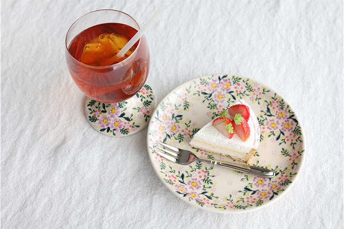 薄紫の花を中心とした雅やかなパターンデザインです。品の良い色使いが、和のテイストを彷彿とさせます。懐紙に描かれていても不思議ではない淑やかな印象です。
