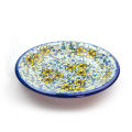 寒色系の中に引き立つ黄色の花々が印象的です。テキスタイル的な柄の配置は、布地のデザインであっても素敵だと思わせます。こんがり焼けたパンやシフォンケーキのようなシンプルな色の食材とは特に相性が良いデザインです。