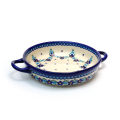 ハンドル付きの円形のオーブン皿は、内側は勿論、サイドにも絵付けされており、見た目もとても可愛らしい雰囲気です。内側の直径は大体20cm程度なので、グラタンやドリアで3人前位の容量になると思います。ラウンド型のケーキやパイやキッシュなどを作ってそのままテーブルに出したり、サラダや炒め物などの盛り皿としての利用も素敵です。日本の標準的なオーブンにも納まるサイズ。