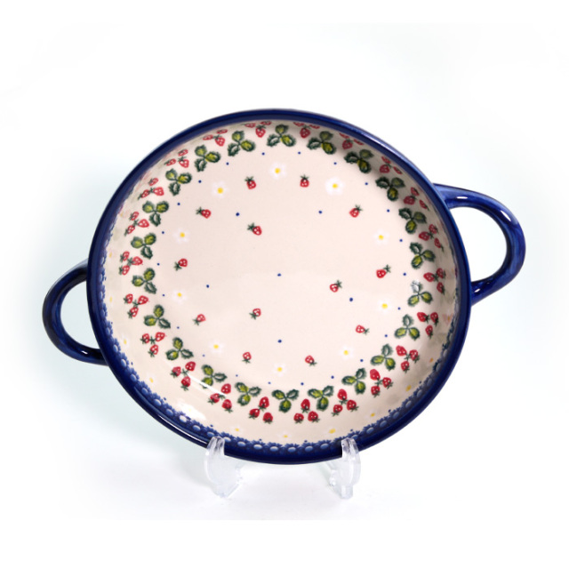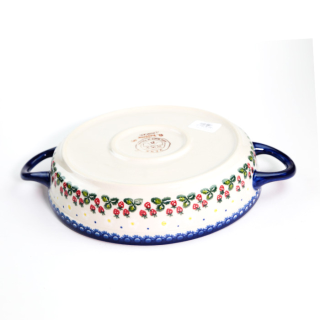 ハンドル付きの円形のオーブン皿は、内側は勿論、サイドにも絵付けされており、見た目もとても可愛らしい雰囲気です。日本の標準的なオーブンにも納まるサイズ感で、内側の直径は大体20cm位です。グラタンやドリアで3〜4人分位の容量になると思います。サラダや炒め物などの盛り皿としてのご利用もおすすめ。ご結婚やお引越しの御祝いとしても人気です。