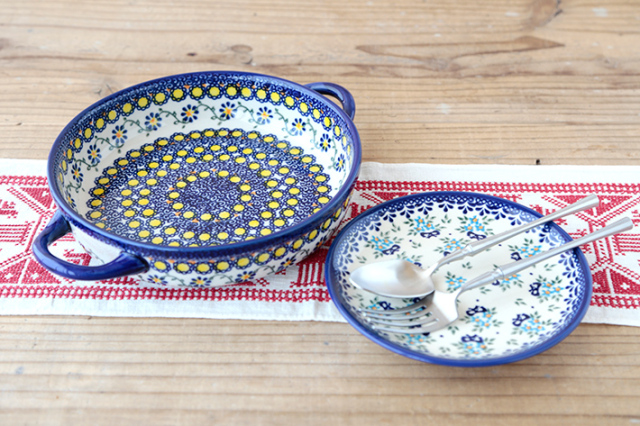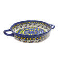 ハンドル付きの円形のオーブン皿は、内側は勿論、サイドにも絵付けされており、見た目もとても可愛らしい雰囲気です。内側の直径は大体20cm程度なので、グラタンやドリアで3人前位の容量になると思います。ラウンド型のケーキやパイやキッシュなどを作ってそのままテーブルに出したり、サラダや炒め物などの盛り皿としての利用も素敵です。日本の標準的なオーブンにも納まるサイズ。
