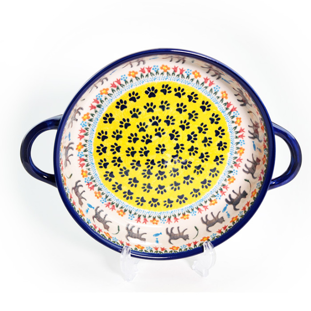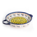 ハンドル付きの円形のオーブン皿は、内側は勿論、サイドにも絵付けされており、見た目もとても可愛らしい雰囲気です。日本の標準的なオーブンにも納まるサイズ感で、内側の直径は大体20cm位です。グラタンやドリアで3〜4人分位の容量になると思います。サラダや炒め物などの盛り皿としてのご利用もおすすめ。ご結婚やお引越しの御祝いとしても人気です。