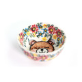 賑やかで明るいフローラルな背景尾に、お昼寝中のくまちゃんが描かれた楽しいデザインです。カップ類では、右手に持った時の正面にくまちゃんが描かれていて、奥の飲み口部分の内側にお花がスタンプされています。