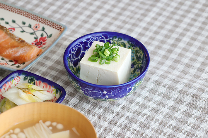 底の部分が直径6cm程度フラットになっています。3口分程度の副菜や1人分のお漬物を装うのにぴったりで小鉢のように使うことができます。ポーリッシュポタリーらしく、側面にも内側にも手作業による絵付けが施されていて、小さなボウルといえども日々使う中で愛着が湧いてくる魅力的な器です。