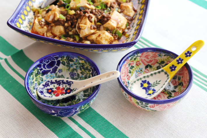 底の部分が直径6cm程度フラットになっています。3口分程度の副菜や1人分のお漬物を装うのにぴったりで小鉢のように使うことができます。ポーリッシュポタリーらしく、側面にも内側にも手作業による絵付けが施されていて、小さなボウルといえども日々使う中で愛着が湧いてくる魅力的な器です。