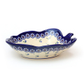 縁取りに使われている8つの花弁の花柄スタンプは、ポーリッシュポタリーのスタンプの中でも最もポピュラーなもののひとつ。クリーム色の余白の部分には、青い小花とドットがあしらわれています。比較的シンプルな構成ながら、バランスの取れたデザインであり、清楚な愛らしい雰囲気に包まれています。