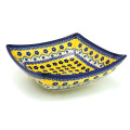 濃い黄色とくっきりとした紺色のスタンプで構成された意匠は、ポーリッシュポタリーの多数派である藍色ベースの配色とはちょっと違った雰囲気です。緑色で縁取りされた白い部分がレースのように見え、この柄のお洒落なアクセントになっています。