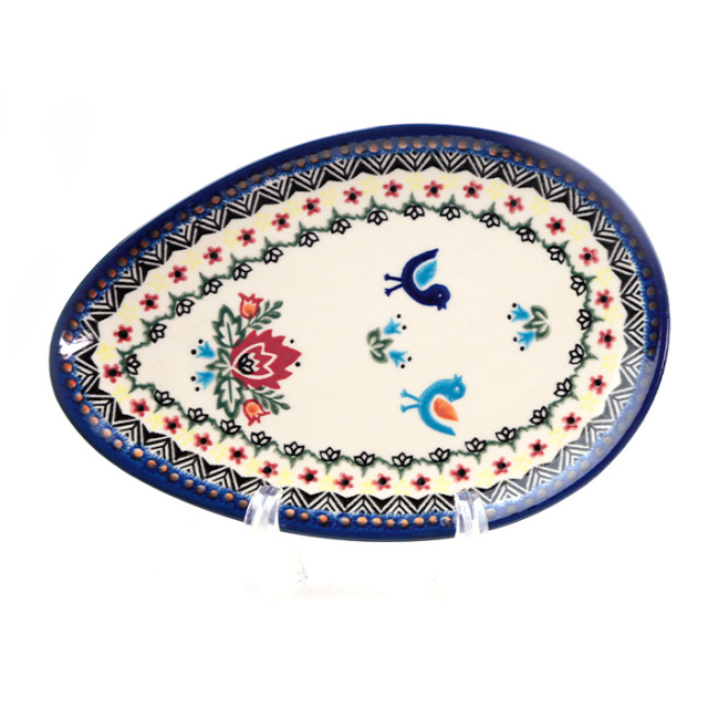 たまごの形が可愛くてユニークなプレート。朝ごはん用のプレートにしたり、上にマグを乗せてお菓子を添えて使ったり、メインディッシュと付け合わせを盛り付けたりと、実際は楽しい使い方を沢山連想できる食器で使い易い形です。自然の産物からかたどられたアシメトリーの絶妙なバランスがこのフォルムの特長で、難易度の高い絵付けの技術も求められます。