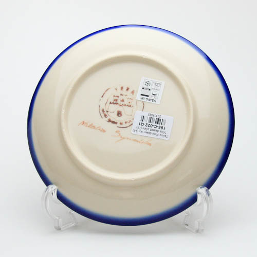 縁取りに使われている8つの花弁の花柄スタンプは、ポーリッシュポタリーのスタンプの中でも最もポピュラーなもののひとつ。クリーム色の余白の部分には、青い小花とドットがあしらわれています。比較的シンプルな構成ながら、バランスの取れたデザインであり、清楚な愛らしい雰囲気に包まれています。