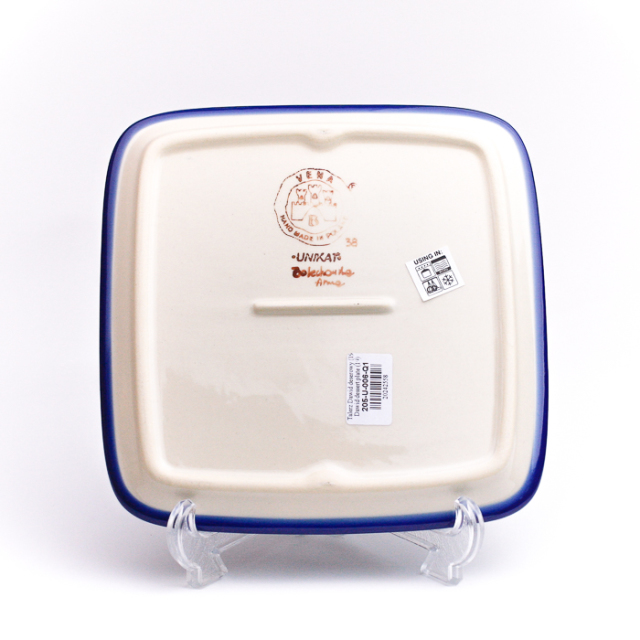 お洒落な20cm四方の角皿。製造元での名称は「Dawid dessert plate」。ケーキを1台載せたりもできますし、小さなケーキを幾つか載せても取りやすく扱いやすいお皿です。ラウンドのプレートと共に使うことで、テーブルにアクセントが生まれ、スタイリッシュなセッティングを可能にしてくれる優れモノ。フラットなのでかさ張らず一枚あるだけでもとても便利で、絵画的な美しさもあるので使わない時には皿立てを使って飾っている方も多い素敵な1枚です。