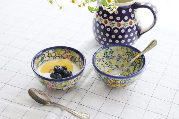 手にも馴染みやすい小ぶりのボウル。ヨーグルトやアイスクリームなどに使いたくなるサイズ感です。ムースやプリン、杏仁豆腐などを冷やし固めるデザートにもぴったり。和の食卓では副菜を入れる小鉢のような使い方もおすすめです。ポーリッシュポタリーらしく内側(見込み)にも絵付けが施されている贅沢な仕様で、使うたびに愛着を感じていただけます。小さなスプーンと併せて可愛らしい贈り物にする方も多い人気のボウルです。