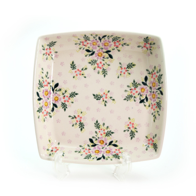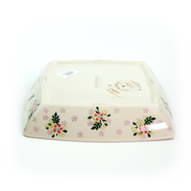 こ少し深さのある角皿で、製造元での名称は「Toffi platter」。タフィー(キャンディ)などを入れる大皿というイメージです。4辺のふくらみが、全体的に柔らかな印象も与えています。ポーリッシュポタリーらしいどっしりとした雰囲気と存在感のある作りです。外側の立ち上がりの部分にも絵付けされており、全体的にも非常に美しく凝った仕上がりが大きな魅力となっています。