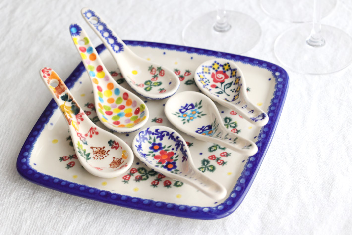 口に運びやすい程よい大きさのポーリッシュポタリーのれんげ。内側と外側に絵付けされ、可愛らしさと実用性を兼ね備えた密かなベストセラーです。製造元での名称は「Chinese Spoon」。とても可愛い小さなれんげです。中華粥や杏仁豆腐が似合いそう。表にも裏にも絵付けがされています。*持ち手部分の先端に穴が開いています。手作業で開けられているため、左右の多少のズレがありますが、ハンドメイドゆえの仕様としてご了承ください。